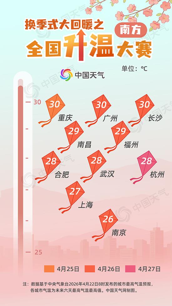 南方比赛“开赛”稍晚,今明天多地气温将降至近期低点,之后陆续开启“回暖大赛”,26日前后暖意达到顶峰。其中,升温最明显的要数长江中下游一带,像合肥今天最高气温℃,26日将℃;武汉、南昌、长沙今天最高气℃左右,26日会升~30℃,回暖如同换季。